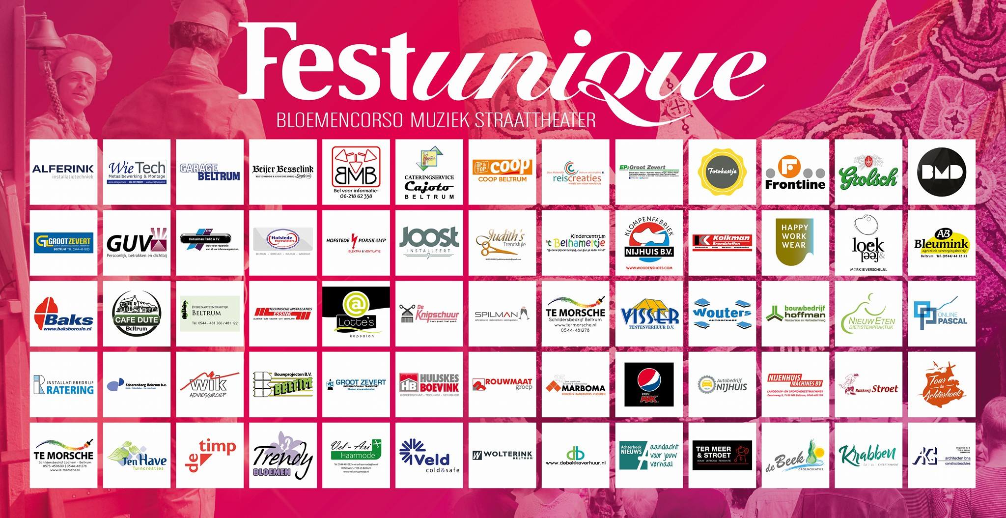 Festunique mag rekenen op de steun van een groot aantal sponsoren. Ze steunen ons met een advertentie in één van onze uitgaven, leveren materialen of sponsoren een onderdeel van dit unieke festijn. Als organisatie zijn we ontzettend trots op deze bedrijven en instellingen. Bedankt voor jullie steun!